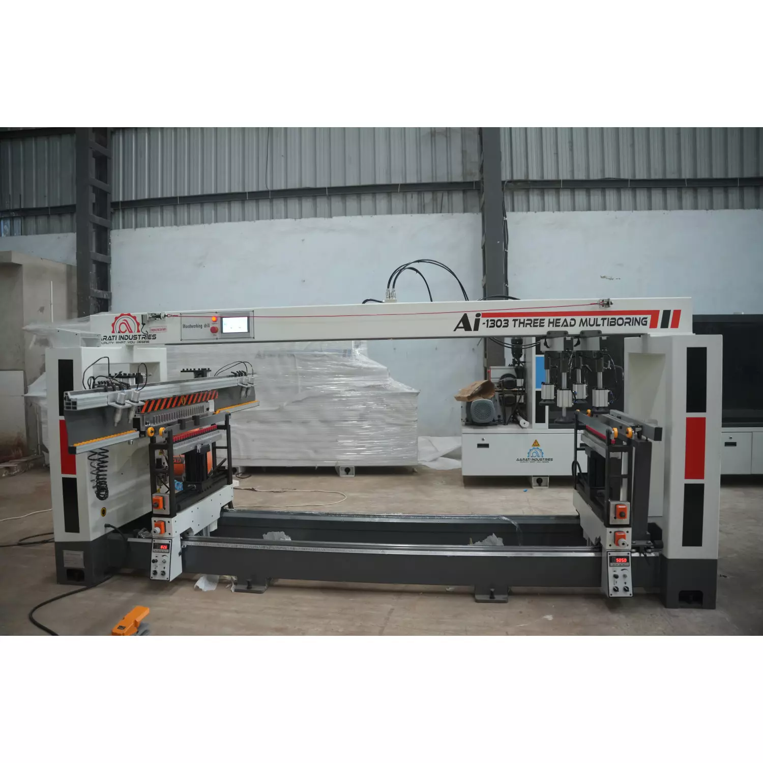 Take your panel processing to the next level with the AI-1303 Multi-Head CNC Drilling Machine from Aarati Industries. Designed for speed, power, and accuracy, this advanced multi-spindle drilling center is ideal for modular furniture, wardrobe, and cabinet manufacturing. With 63 drill shafts (21x3), a smart Touchscreen PLC system, and a rugged build, the AI-1303 ensures perfect hole alignment, high-speed drilling, and long-term performance.